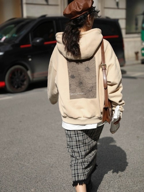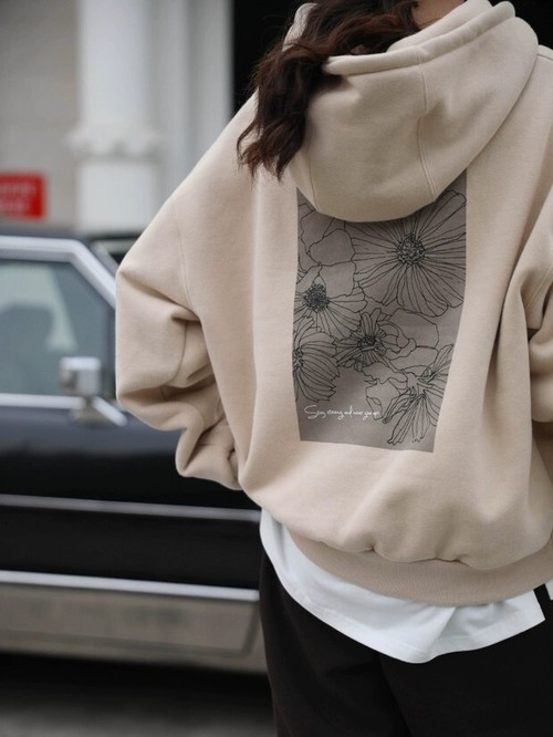 バックにレトロなデザインがプリントされたフードパーカー。
